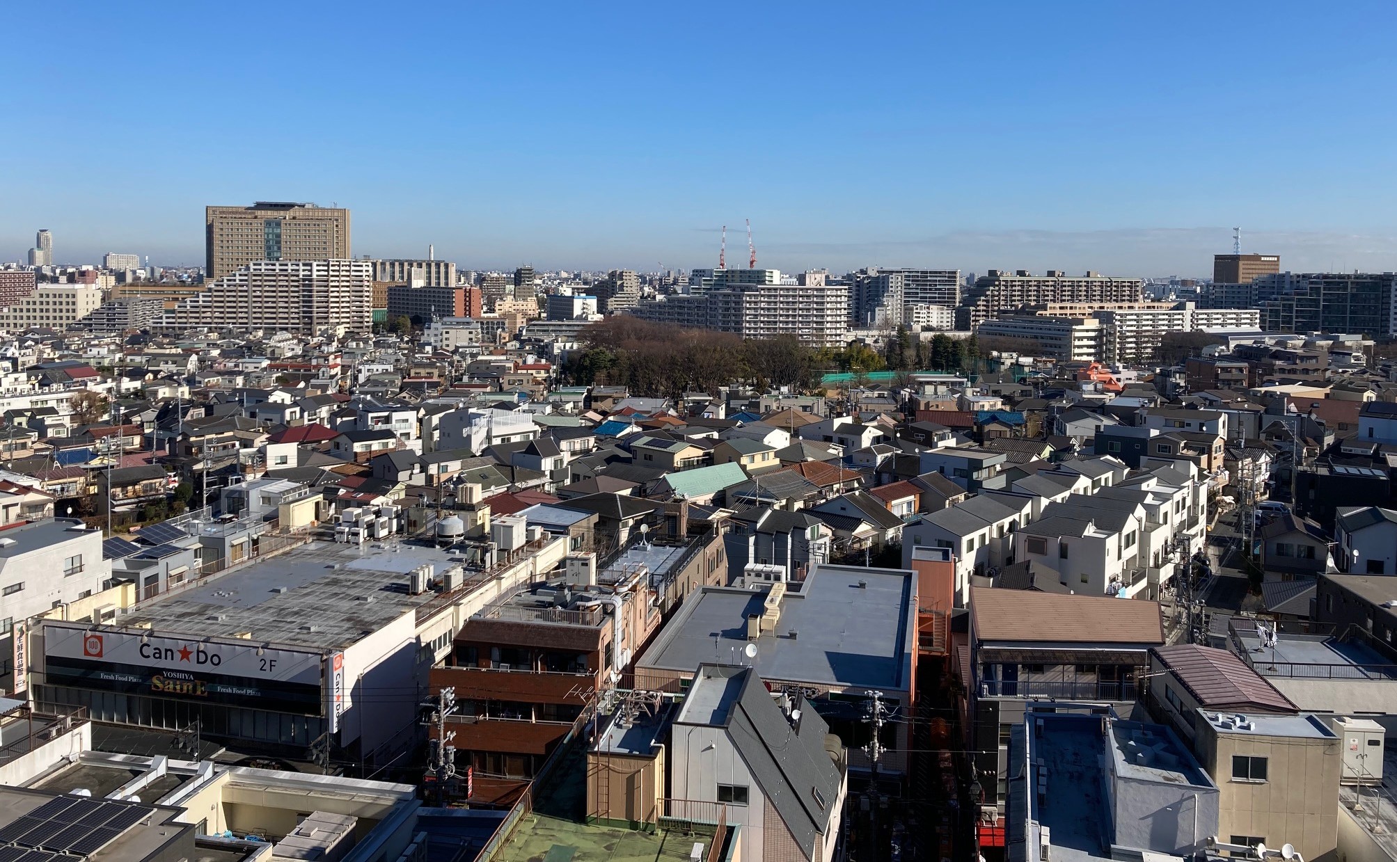 写真は町会にあるマンションから撮影したものです。中央のこんもりした木立(こども動物公園)の手前までが大体の町会の範囲です。